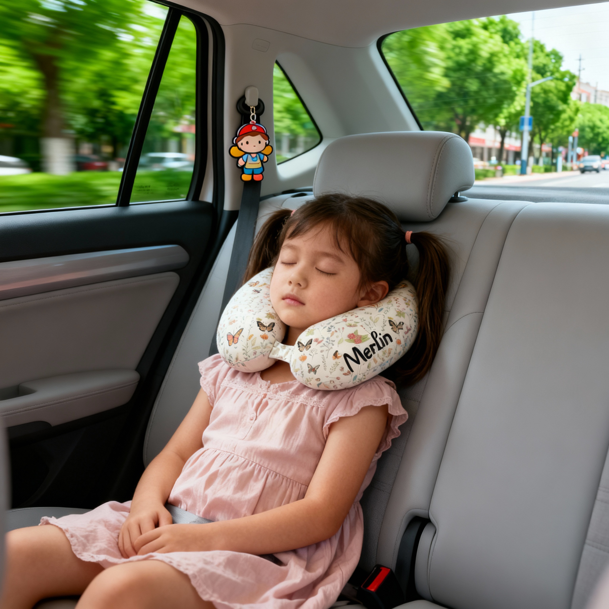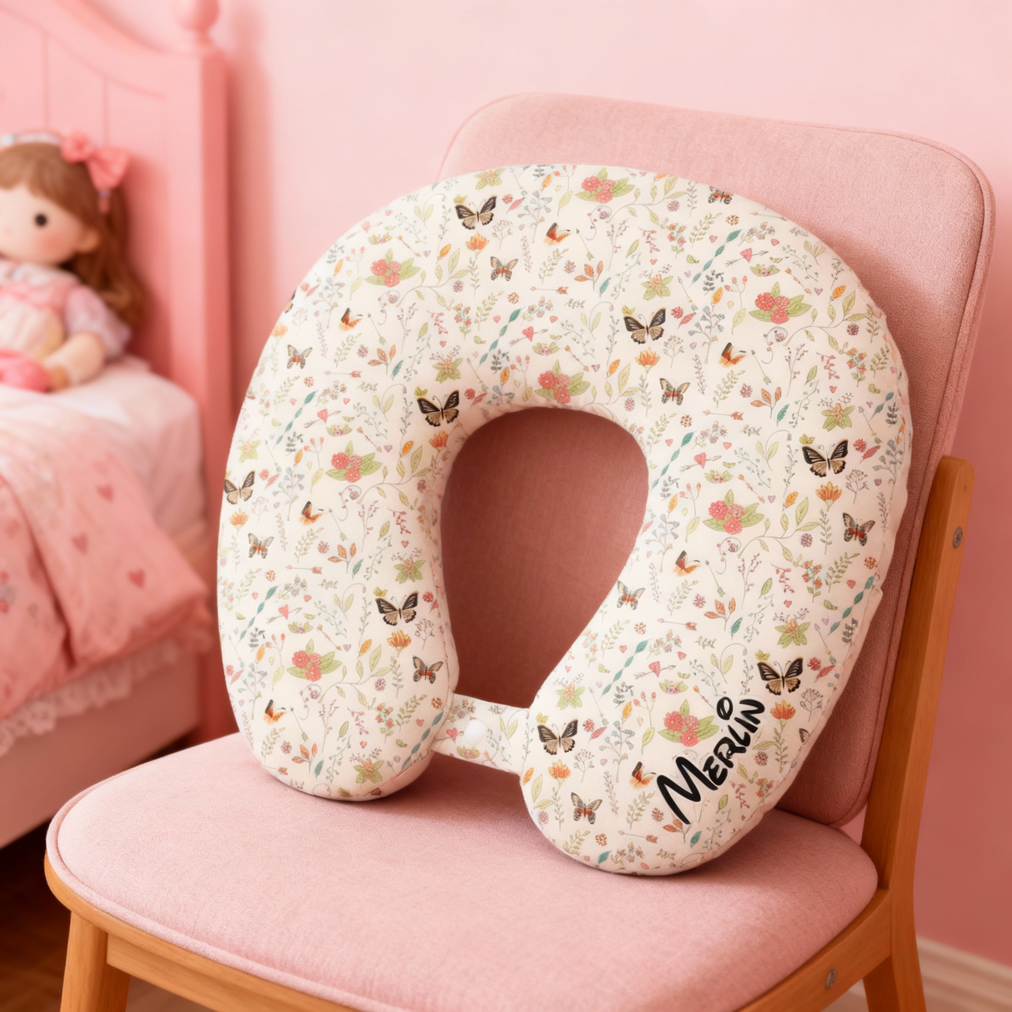 Personlig U-formad kudde med mönster av fjärilar och blommor som kan anpassas med namn perfekt resegåva för flickor