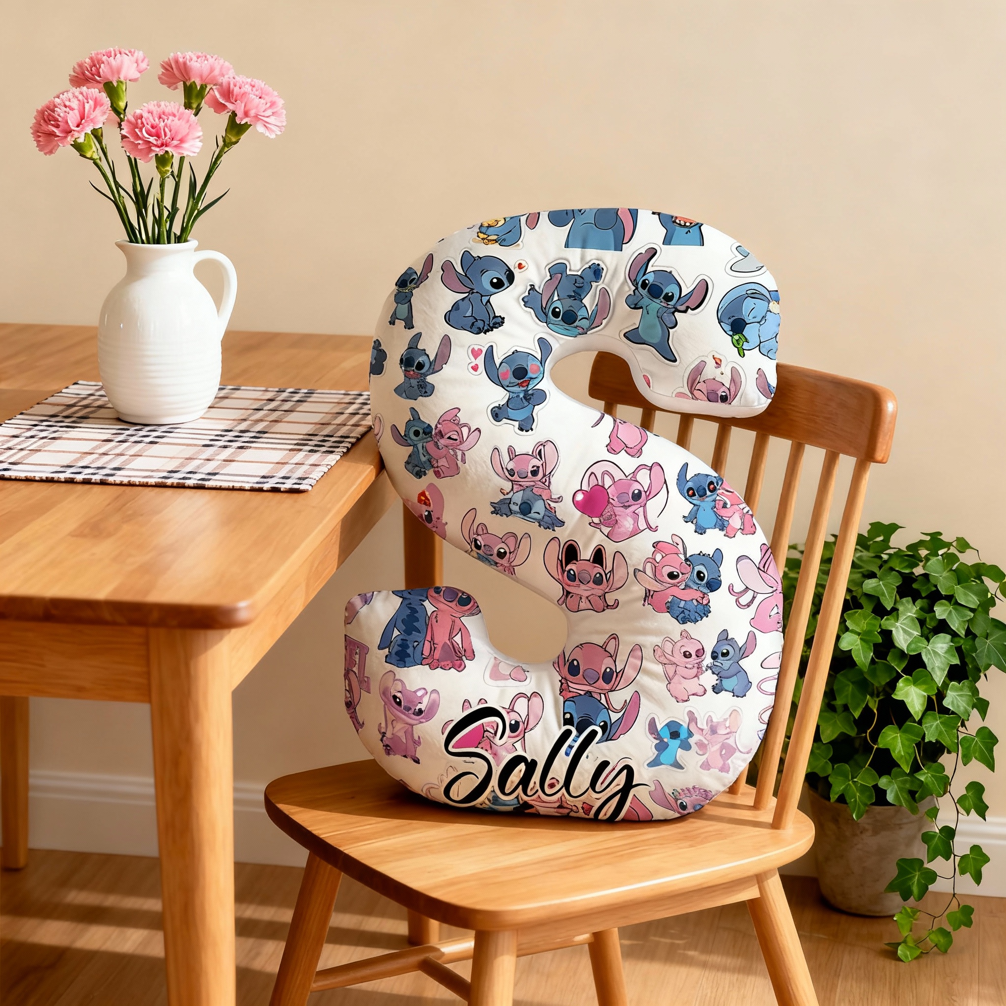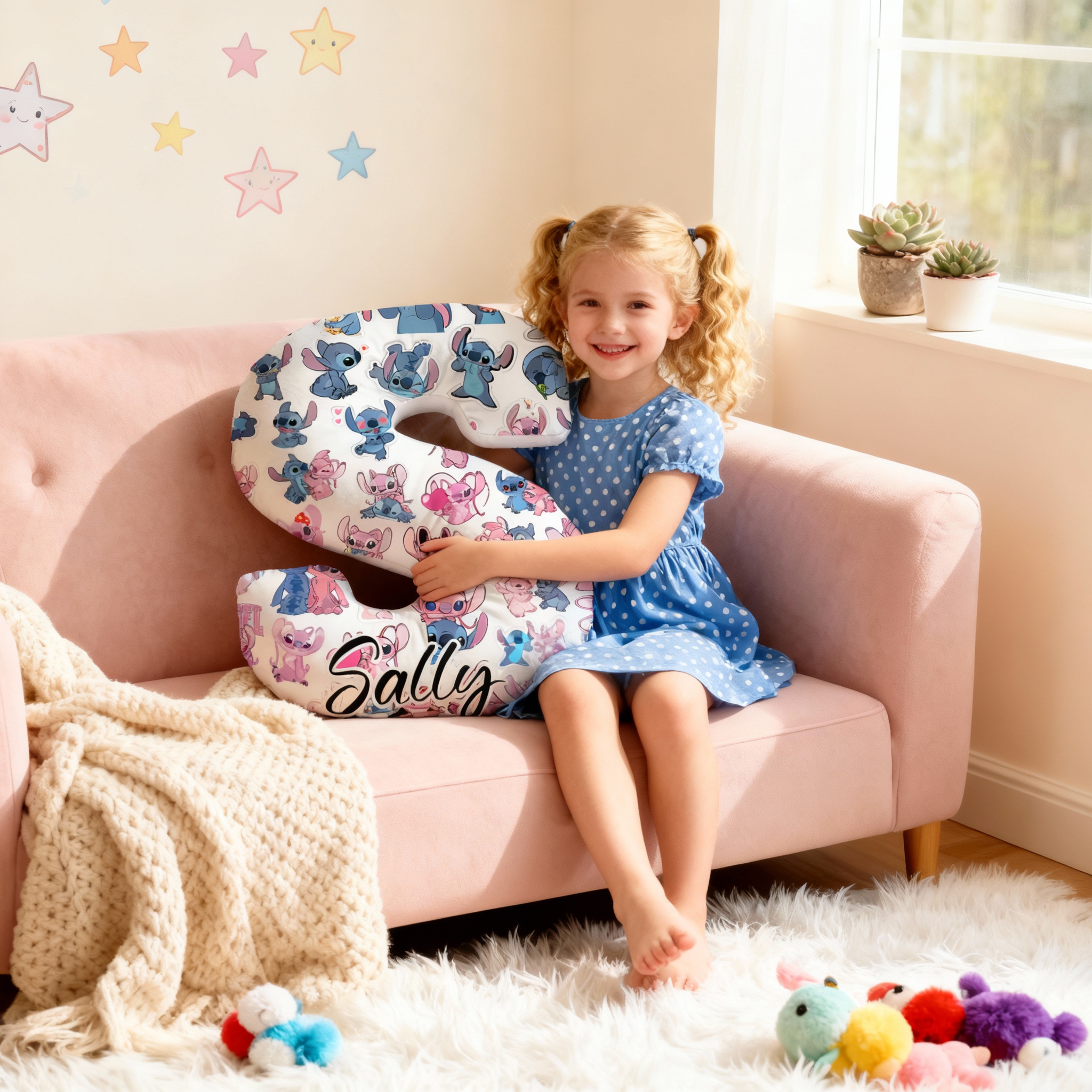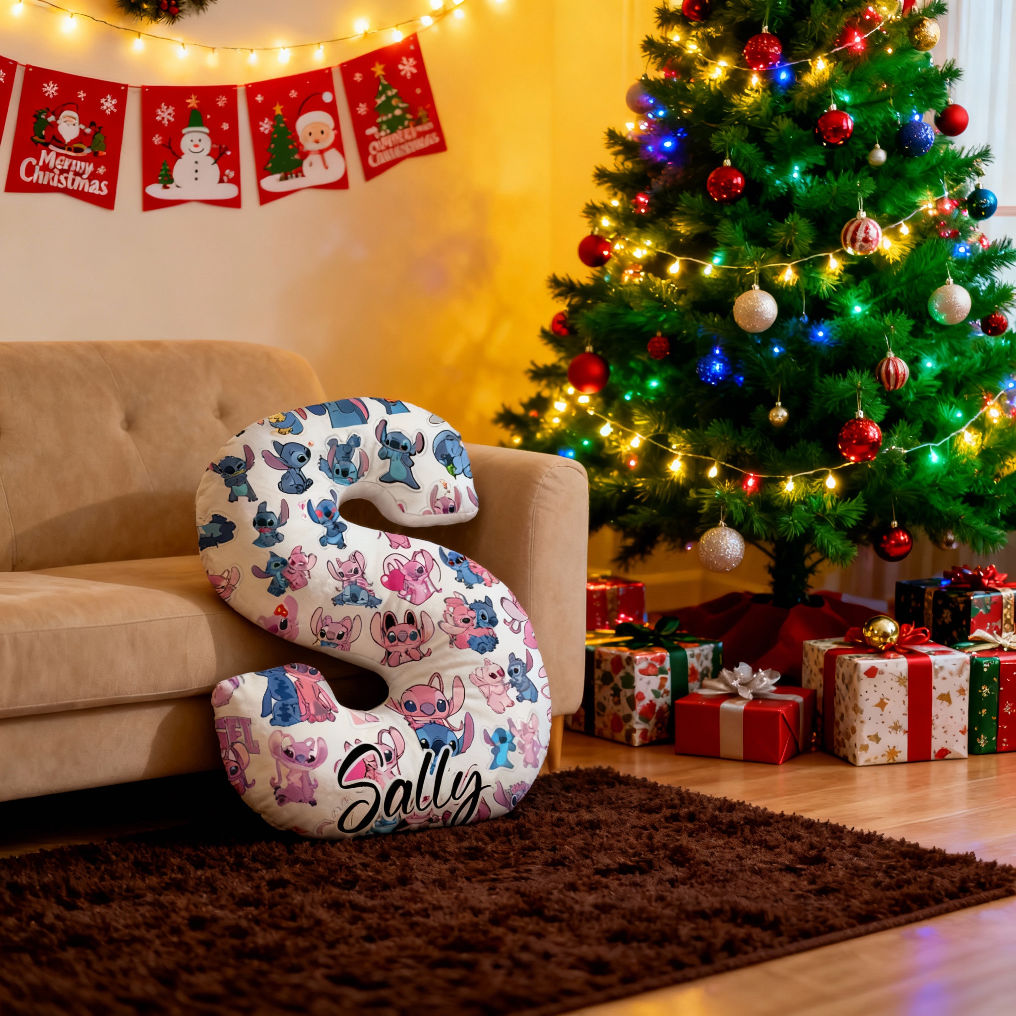Personliga kuddar med tecknade figurer och bokstavsmönster som julklappar till barn
