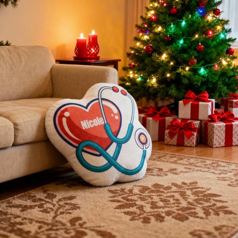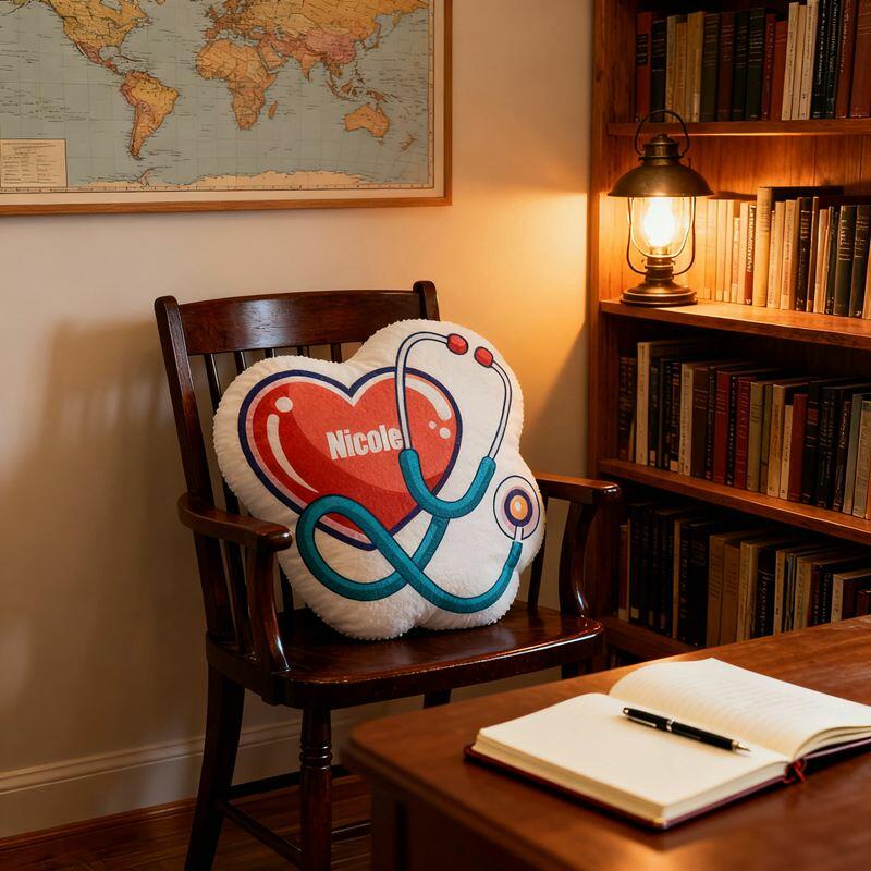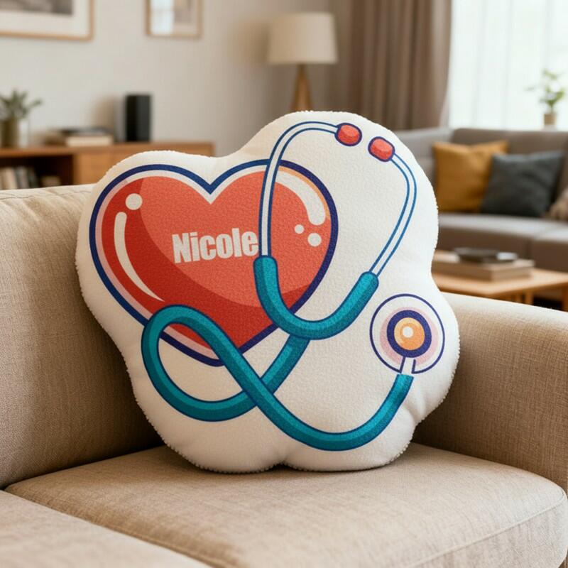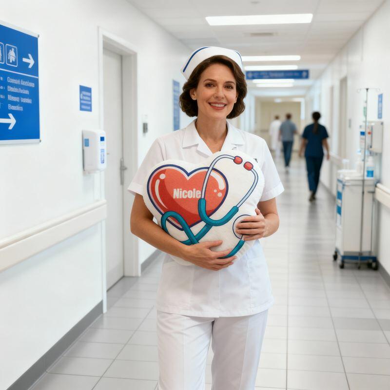 Personlig kudde i form av en tecknad figur med stetoskop och hjärta present till sjuksköterskor och läkare