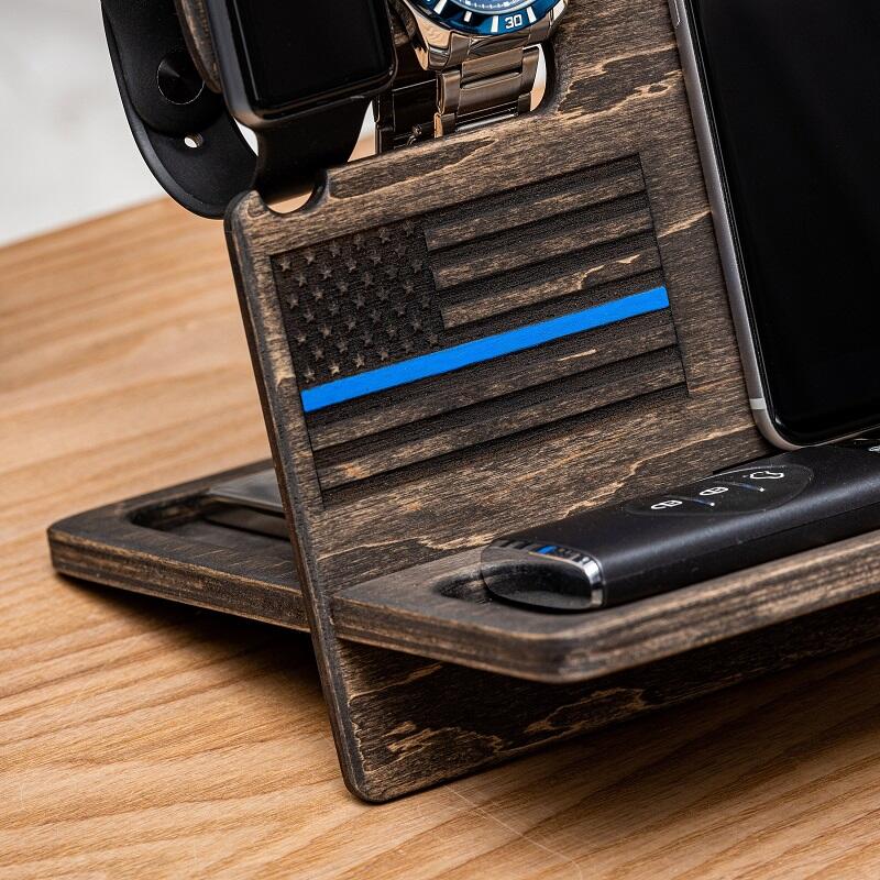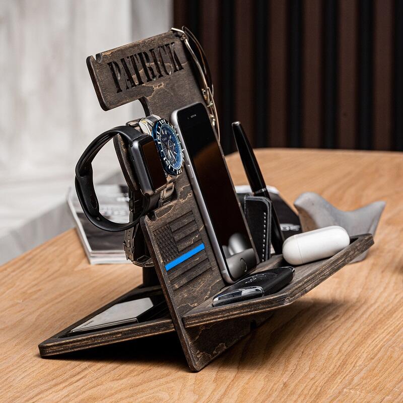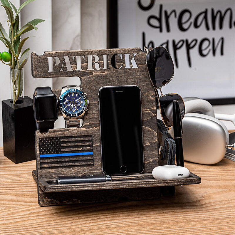 Personlig skrivbord-ordnare Telefon-dockningsstation Träställning Anpassat hål-namn-design Funk-tionellt gåva för honom