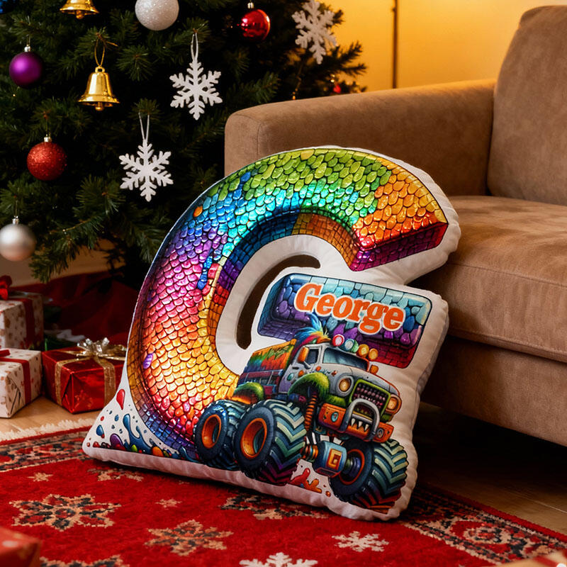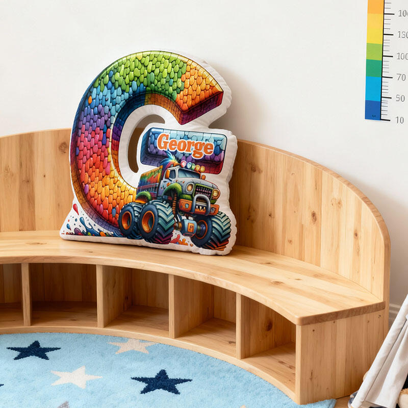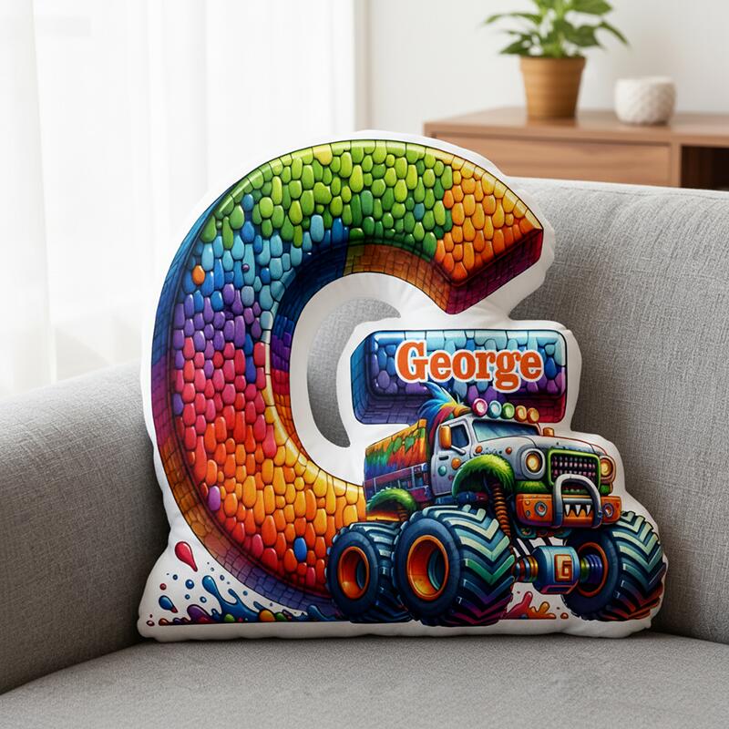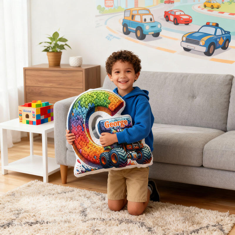 Personlig bokstavskudde med mönster av terrängfordon i tecknad stil en cool present till pojkar