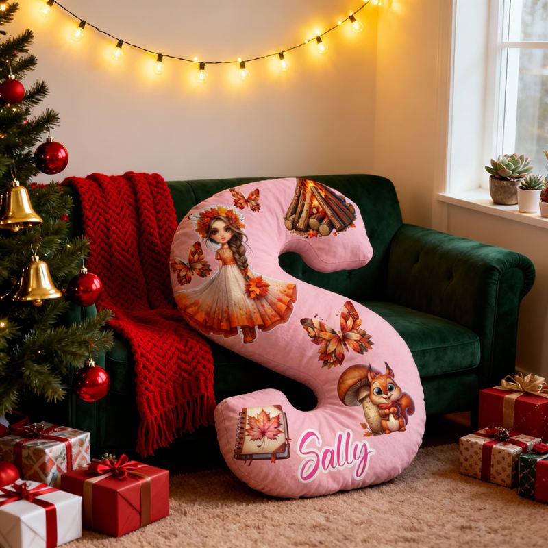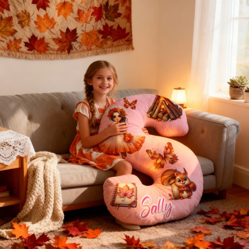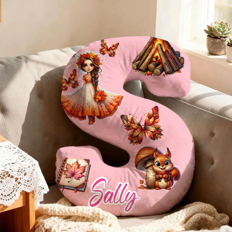 Personlig bokstavsformad kudde med lägereld fjärilar och höstkänsla present till barn