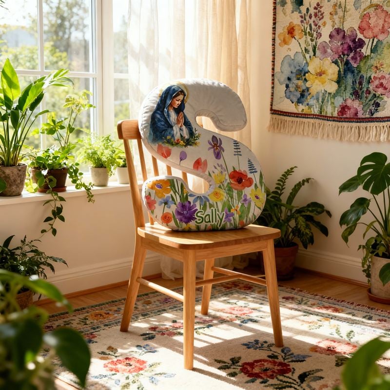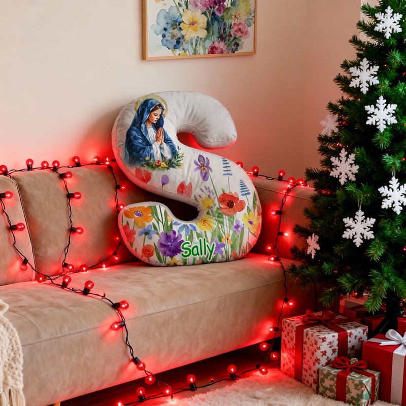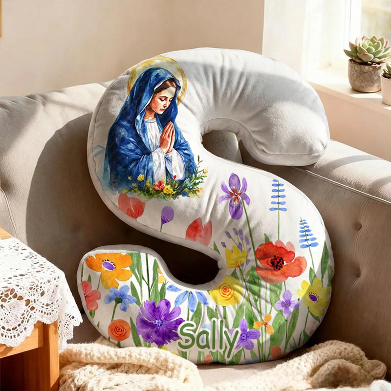 Personlig bokstavsformad kudde med bönande kvinna och blommor religiös present till henne