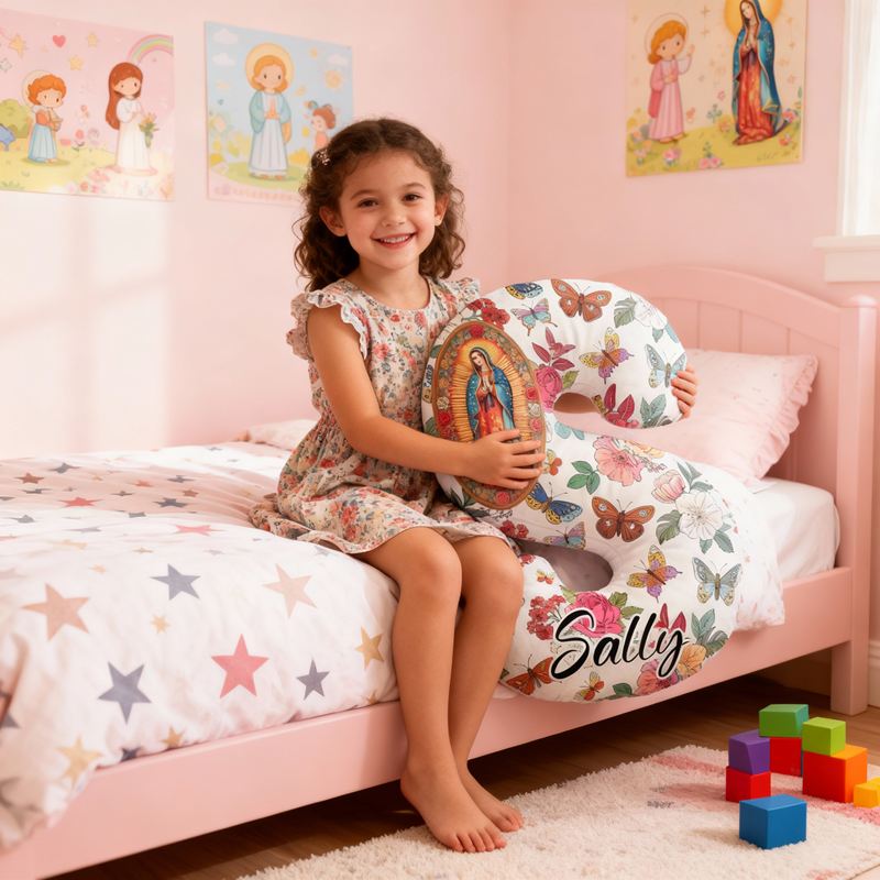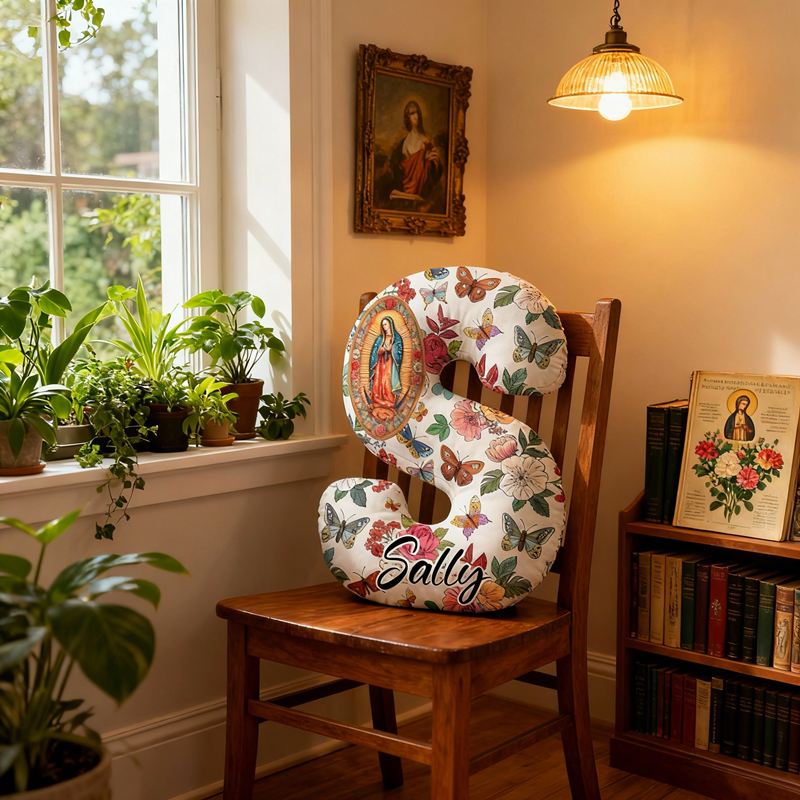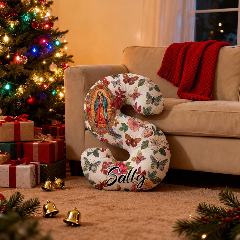 Personlig bokstavskudde med Jungfru Maria blommor och fjärilar en elegant present till henne