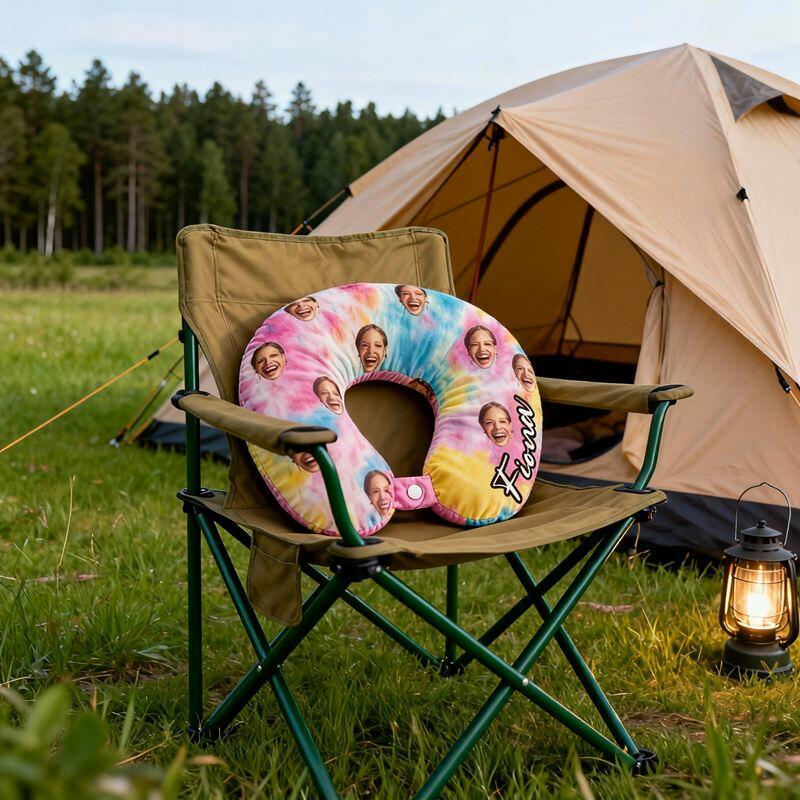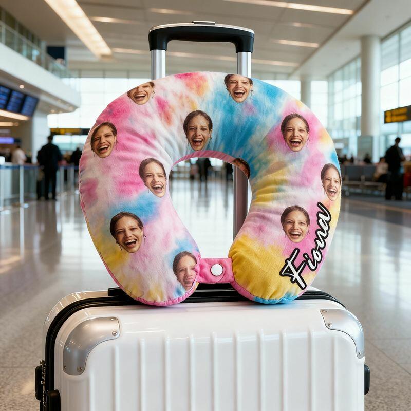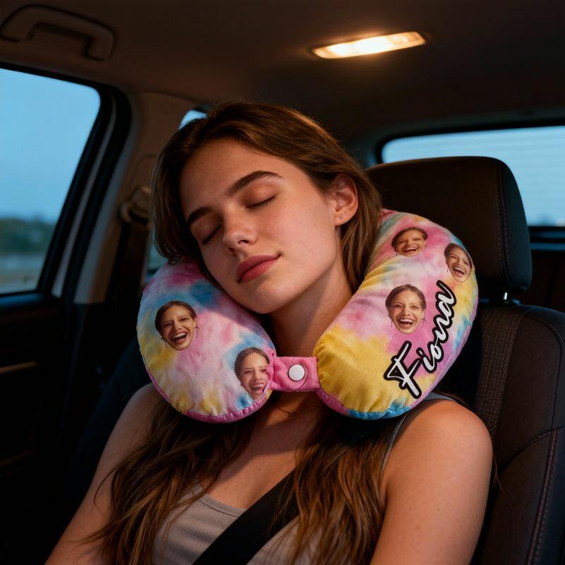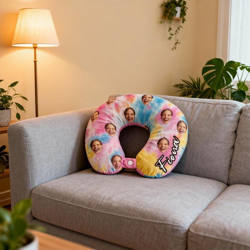 Personlig U-formad nackkudde med eget foto och färgglad teckning resegåva till henne