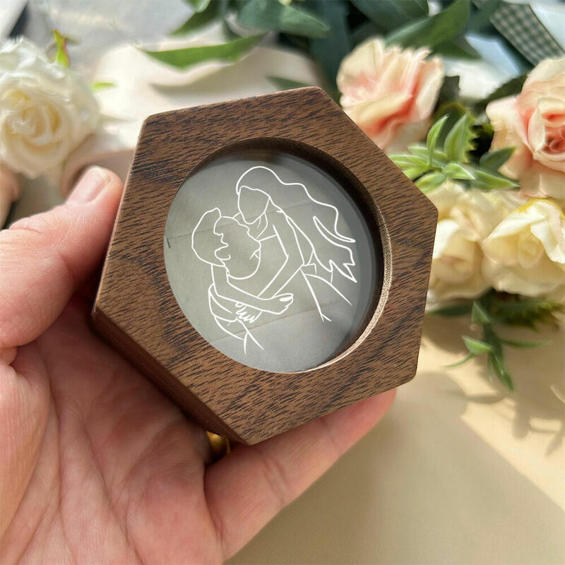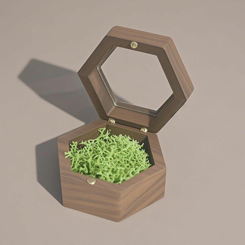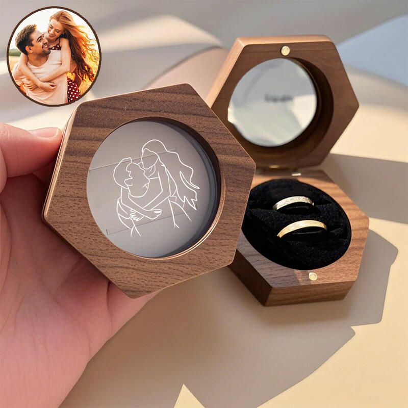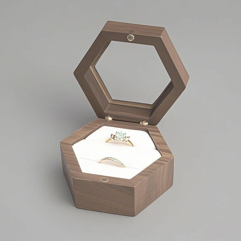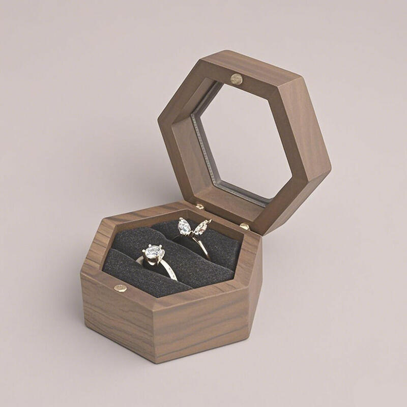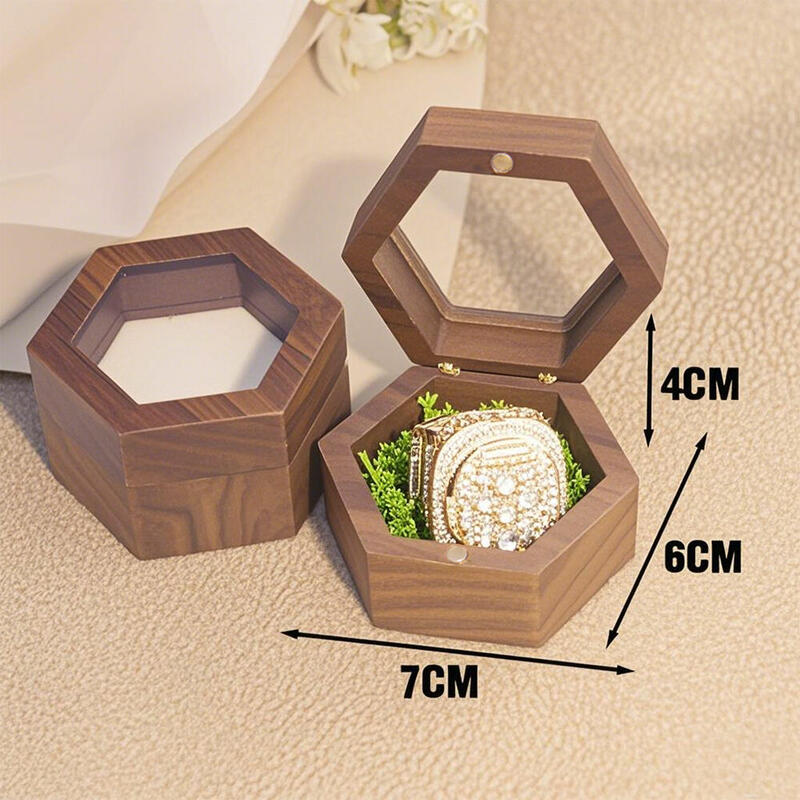 Personlig valnötringbox Hexagonalt akrylfönster Vintage smyckeskrin för äktenskapsförslag